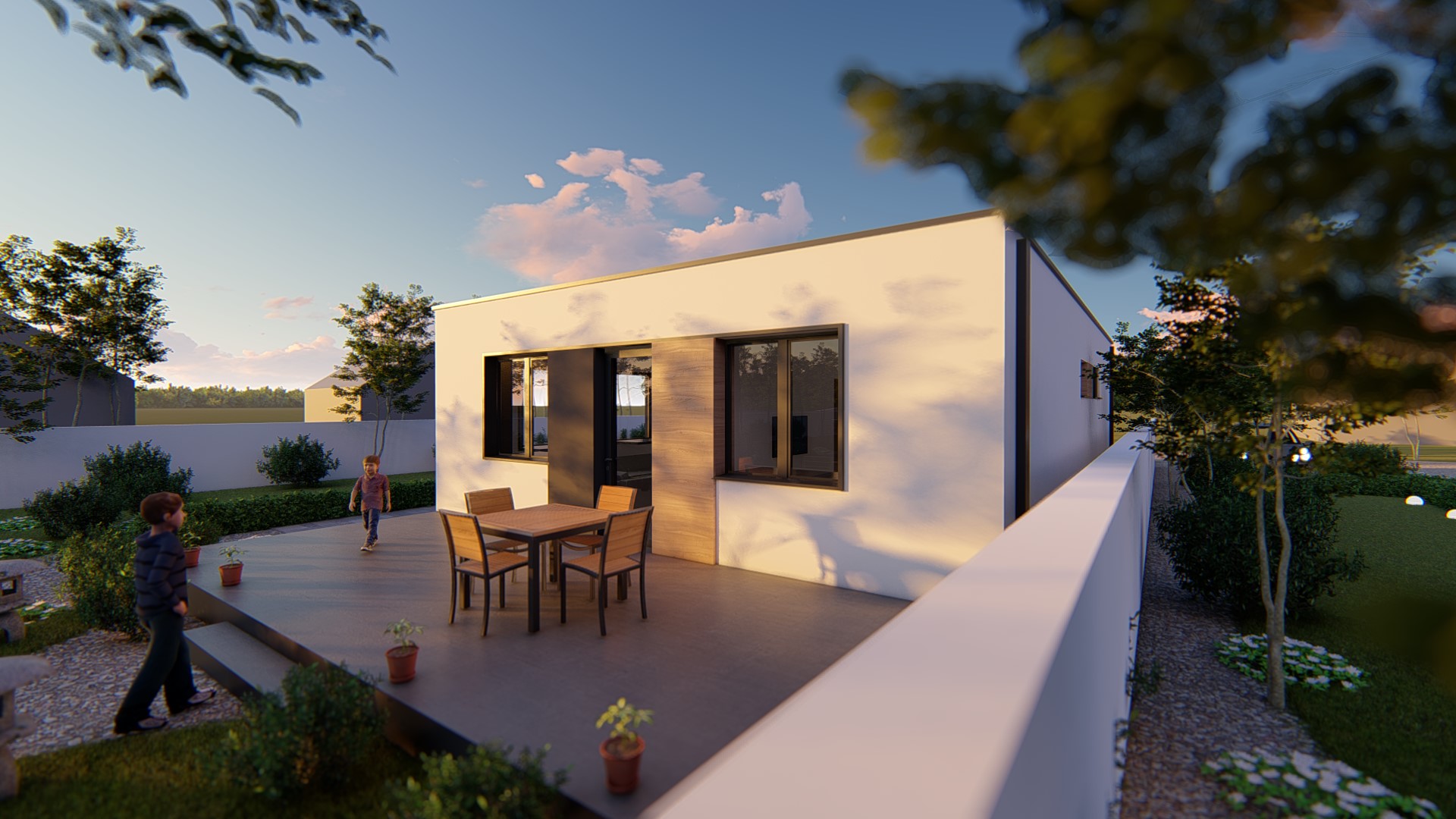 Írisz mod1 típustervünk 90 nm lakótérre kibővített változata egy magasabb életszínvonalat képvisel a kényelmesebb szobák, nagyobb közösségi terek által. Emellett egy háztartási helyiség is helyet kapott az épületben.