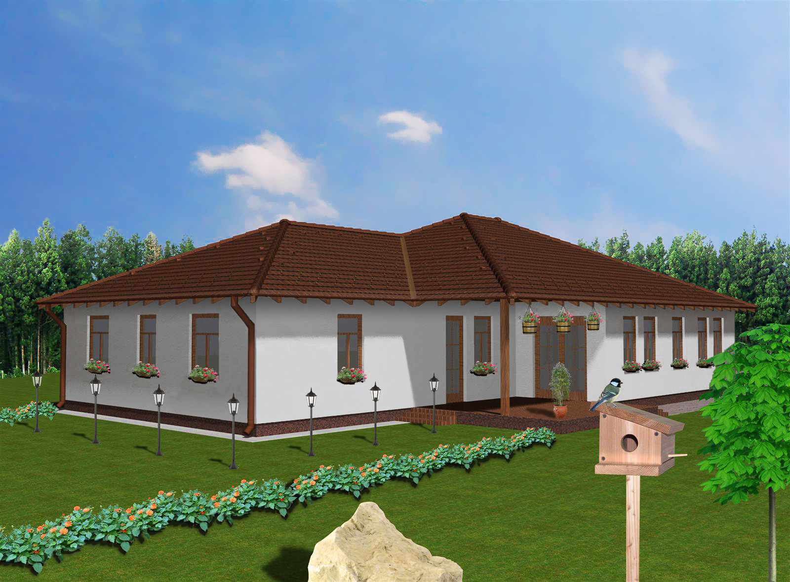 Ebben a házban jól érvényesülnek a klasszikus, jól bevált térelhatárolási módok. Funkcionálisan teljes ház, amely oldalhatáros beépítésű telkekre ajánlott. Jól módosítható szélességével akár keskenyebb telkekre is alkalmazható. A félszoba egyaránt alkalmas dolgozó szobának vagy vendégszobának, de könyvtárszoba is kialakítható benne.